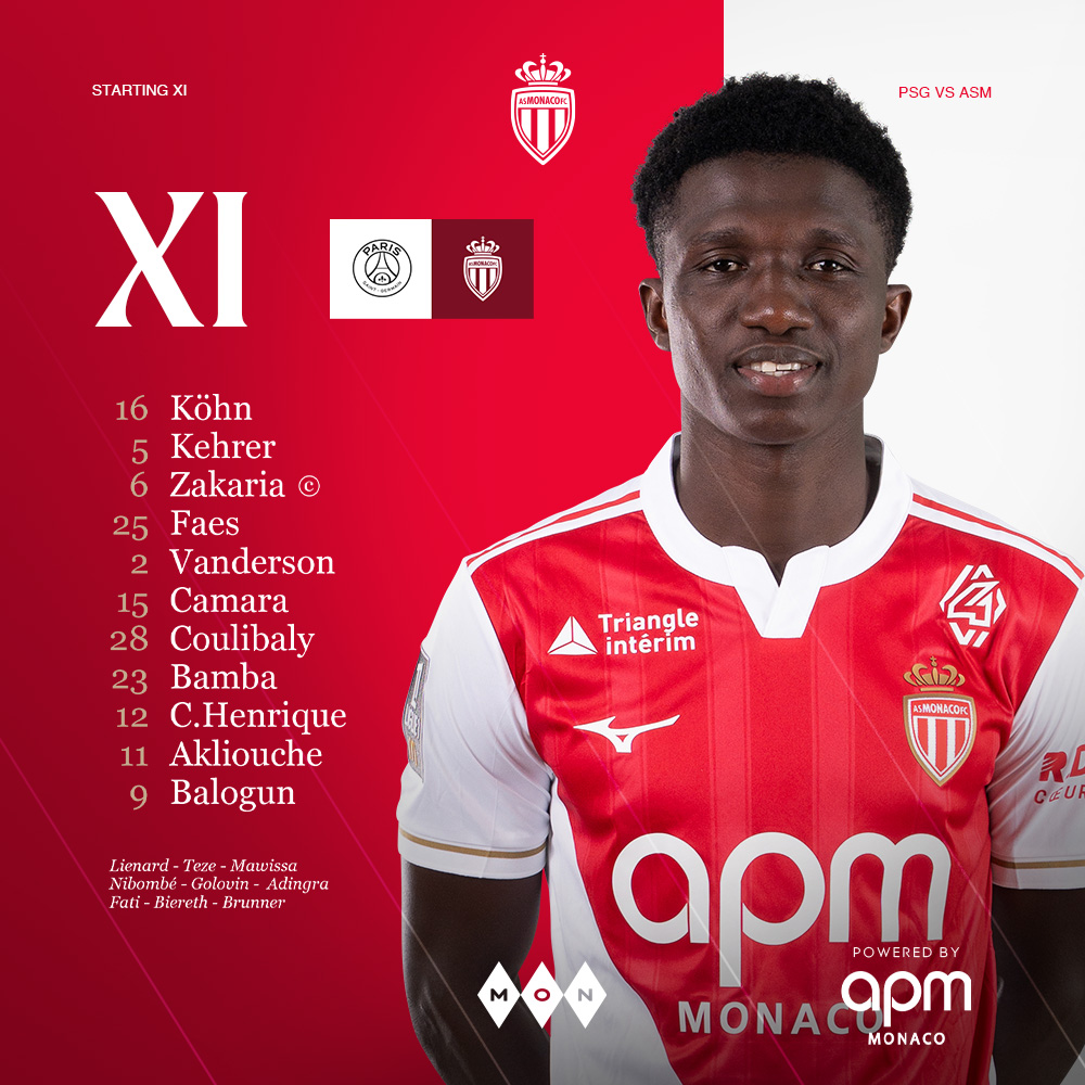 AS Monaco : Köhn – Kehrer, Zakaria ©, Faes – Vanderson (Teze, 15e), Camara, Bamba (Golovin, 54e), C.Henrique (Mawissa, 54e) – Akliouche (Adingra, 81e), Coulibaly – Balogun (Biereth, 81e)