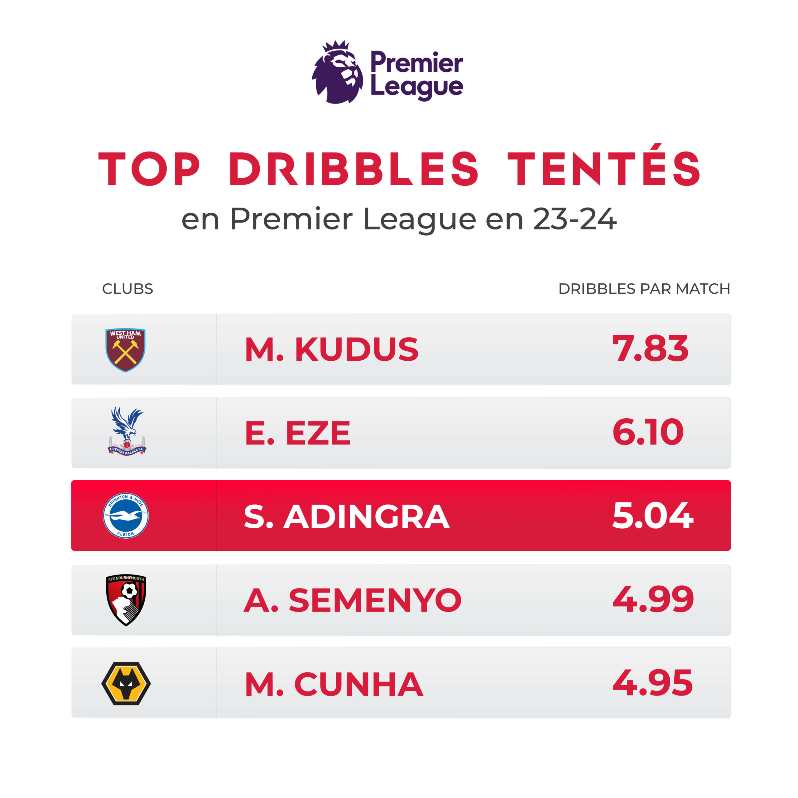 Là encore, il est en bonne compagnie avec les Bukayo Saka, Anthony Gordon et autre Jérémy Doku. Toujours généreux dans l’effort, Simon l’a encore prouvé récemment en étant parmi ceux qui totalisent le plus de sprints en moyenne par match en cette première partie de saison à Sunderland (17,5). Un argument supplémentaire pour attester de son profil d’ailier infatigable, lui le 9e plus gros dribbleur de Premier League sur les trois dernières années (4,64 en moyenne/match).