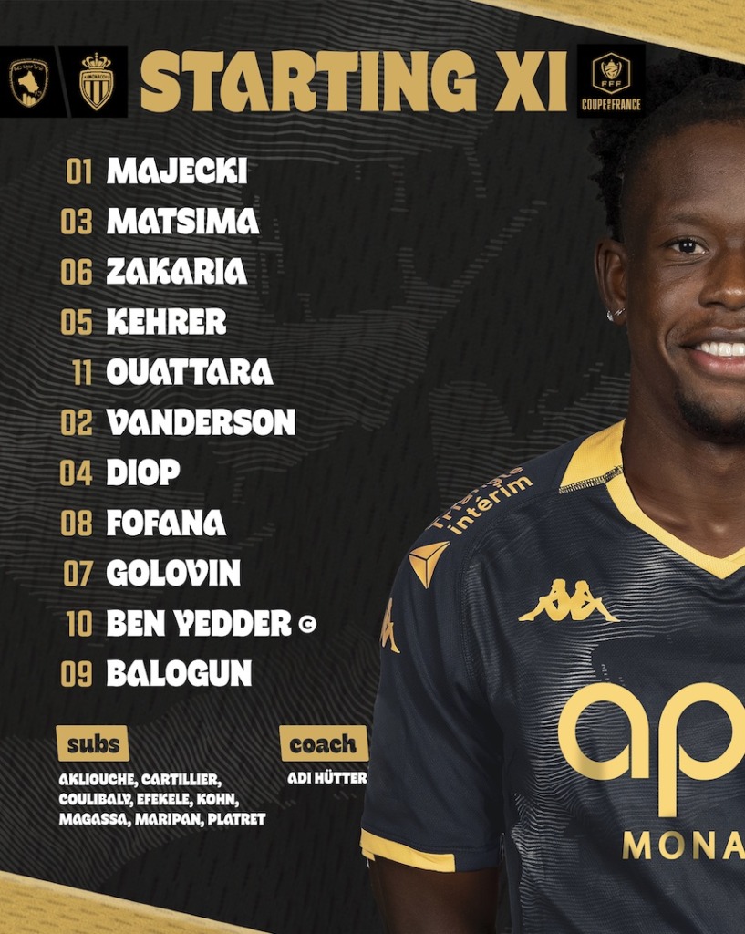 AS Monaco: Majecki - Matsima, Zakaria, Kehrer - Vanderson, Diop (Akliouche, 46'), Fofana, Ouattara (Cartillier, 91') - Golovin (Coulibaly, 91') - Balogun, Ben Yedder ©️