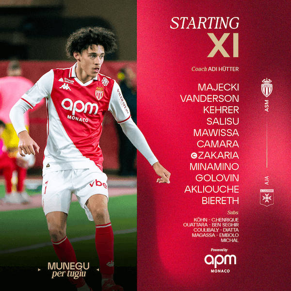 AS Monaco:Majecki - Vanderson (Diatta, 62'), Kehrer, Salisu, Mawissa (C.Henrique, 46') - Camara (Magassa, 46'), Zakaria © - Akliouche, Minamino (Ben Seghir, 87'), Golovin (Embolo, 46') - Biereth