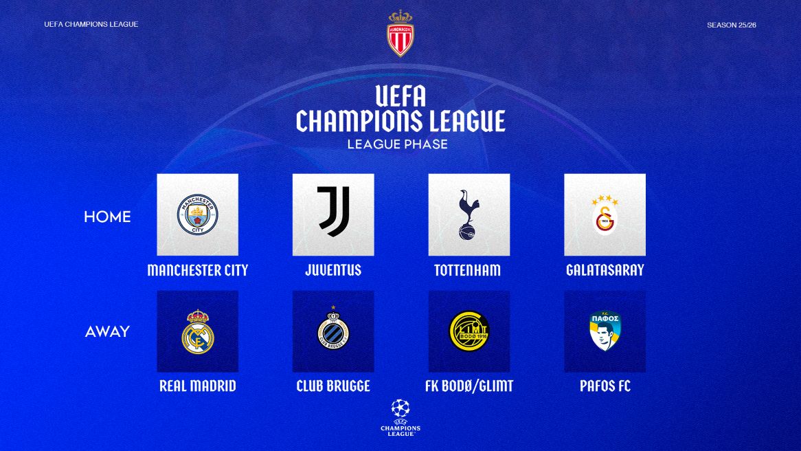 Matchday 1: Club Brugge - AS Monaco (Thursday 18 September, 6.45pm)Matchday 2: AS Monaco - Manchester City (Wednesday 1 October, 9pm)Matchday 3: AS Monaco - Tottenham (Wednesday 22 October, 9pm)Matchday 4: Bodø Glimt - AS Monaco (Tuesday 4 November, 9pm)Matchday 5: Pafos - AS Monaco (Wednesday 26 November, 6.45pm)Matchday 6: AS Monaco - Galatasaray (Tuesday 9 December, 9pm)Matchday 7: Real Madrid - AS Monaco (Tuesday 20 January, 9pm)Matchday 8: AS Monaco - Juventus Turin (Wednesday 28 January, 9pm)