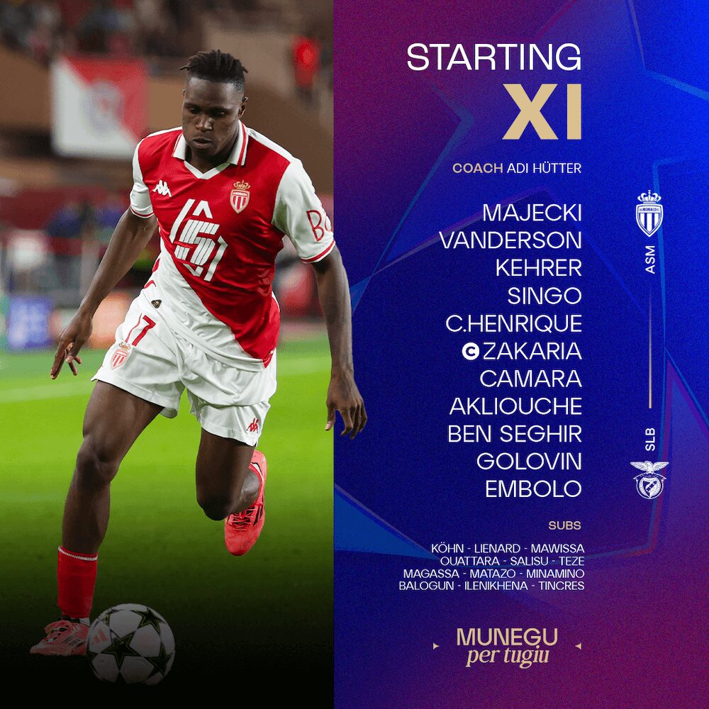 AS Monaco:Majecki - Vanderson, Singo, Kehrer, C.Henrique (Mawissa, 57') - Camara (Magassa, 57'), Zakaria © (Ilenikhena, 91') - Akliouche, Ben Seghir (Salisu, 63'), Golovin - Embolo (Balogun, 63')