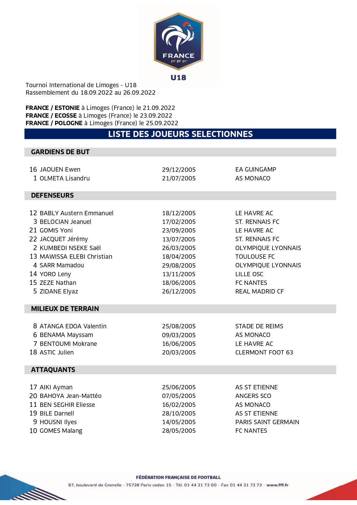 Appelées dans le cadre de la 15e édition du Tournoi international Foot Avenir de Limoges Lafarge du 21 au 25 septembre prochain, nos jeunes pousses seront consécutivement opposées à l'Estonie le 21 septembre (19h), à l'Écosse le 23 septembre (19h) puis à la Pologne le 25 septembre (15h).Bravo les gars !