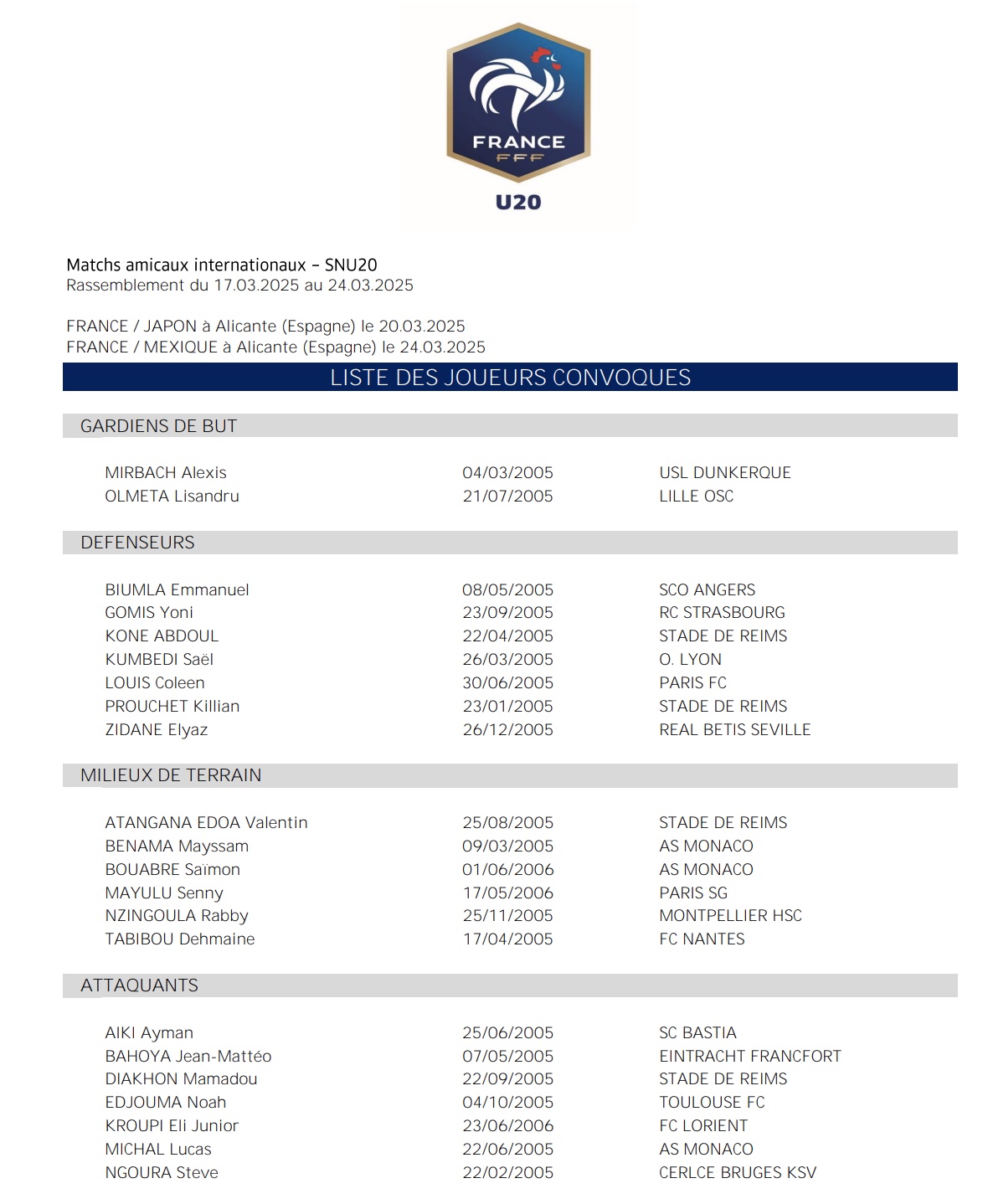 Ils vont ainsi avoir l’occasion de se confronter à deux belles nations dans le cadre de ce stage à Alicante en Espagne, puisqu’ils vont affronter le Japon le jeudi 20 mars puis le Mexique quatre jours plus tard (lundi 24 mars).