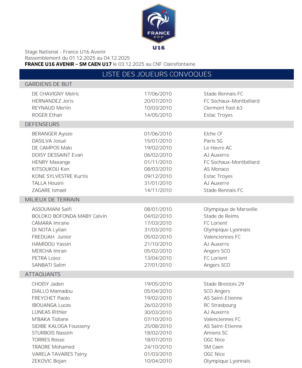 Et ce, avant d’intégrer le centre de formation monégasque en juillet dernier au sein du Groupe U17. Le défenseur central a donc été retenu en compagnie de 34 joueurs choisis parmi les meilleurs éléments français de la génération 2010, pour un stage qui se déroule du lundi 1er au jeudi 4 décembre.
