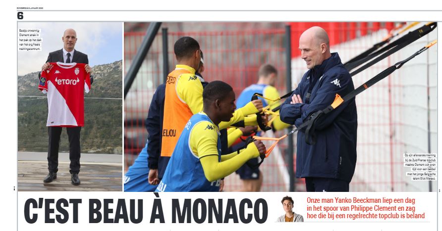 Philippe Clement occupe aussi la Une du SportWereld, dont le titre de l’article retraçant la conférence de presse est évocateur : « C’est beau à Monaco ».