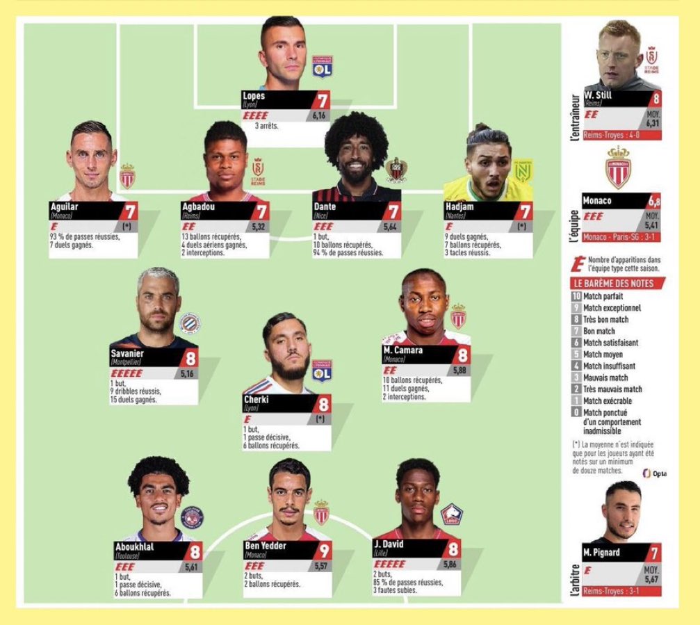 Mais en plus de leur présence dans l’Equipe Type, les deux tricolores figurent également dans celle des Français du week-end. Ils retrouvent alors un autre monégasque : Youssouf Fofana. Lui aussi auteur d’une grande rencontre, il a récupéré dix ballons, réalisé quatre interceptions et est à l’origine du premier but sur un sublime sombrero pour éliminer son défenseur avant de servir Wissam Ben Yedder aux six mètres.