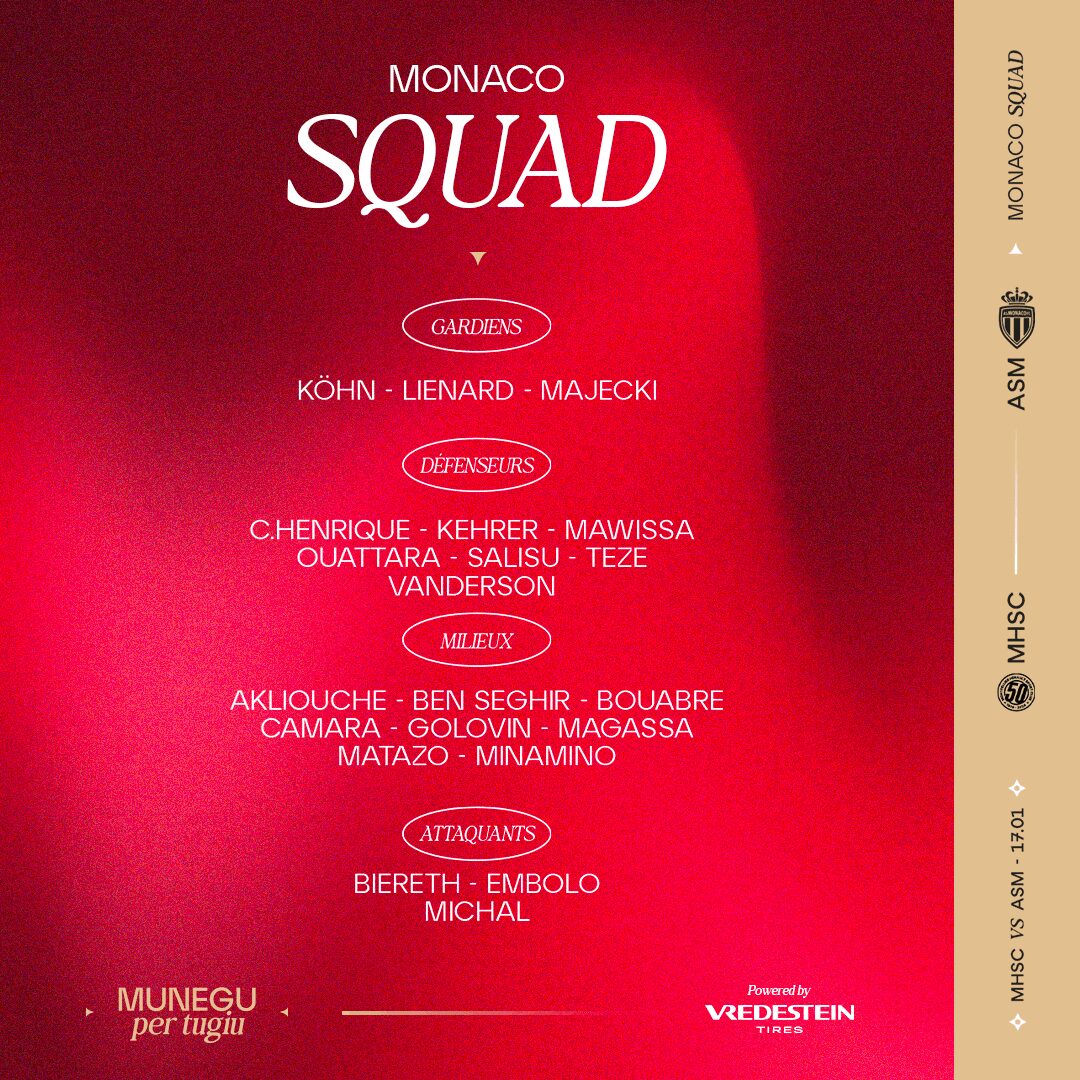 Mais avant d’en découdre dans cette rencontre importante dans la course au podium, qui sera diffusée sur les antennes de DAZN et à suivre en live-texte sur asmonaco.com, voici le groupe convoqué par le coach Adi Hütter. Avec à noter les retours importants de Maghnes Akliouche, Aleksandr Golovin et Christian Mawissa.