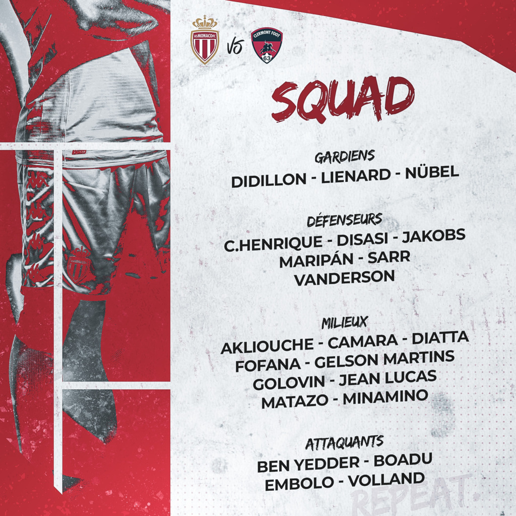 Pour tenter de remporter un sixième succès de rang à l’occasion de cette rencontre de la 11e journée, laquelle sera à suivre en direct sur Canal+ Foot et en live-texte sur asmonaco.com, voici donc le groupe convoqué par le technicien flamand.