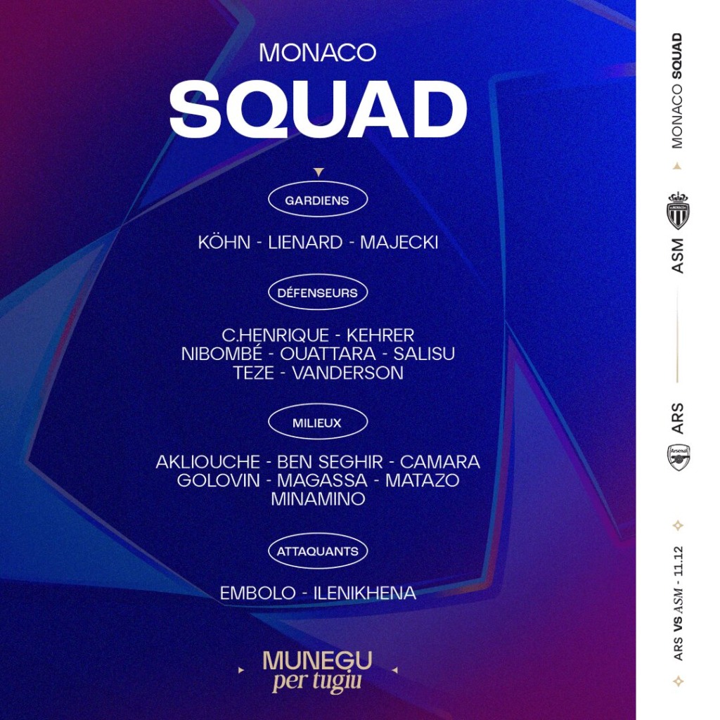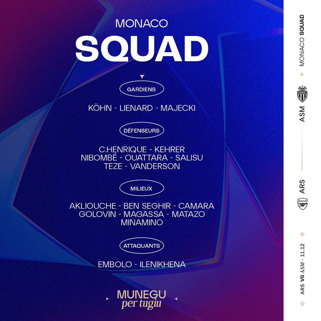 👥 Le groupe de l’AS Monaco 🆚 Arsenal 🇪🇺