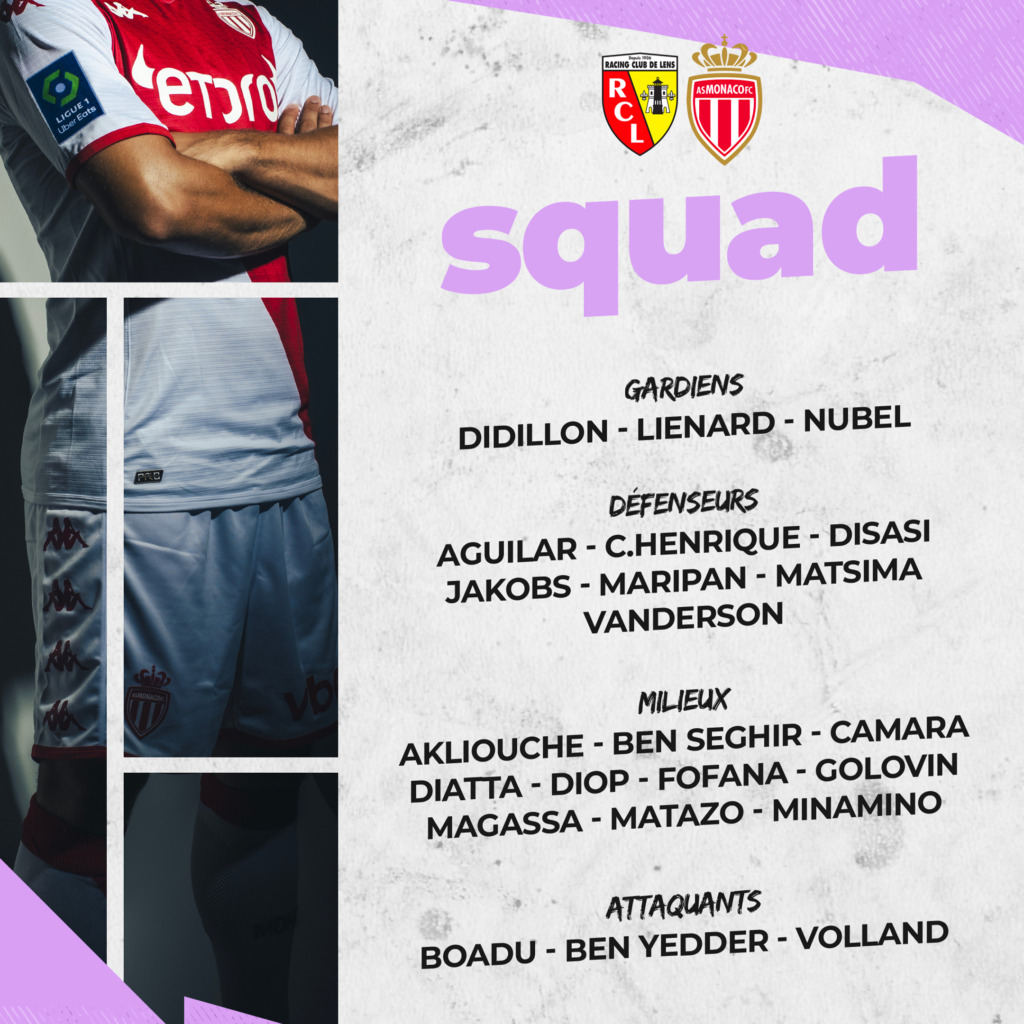 Samedi, il faudra tout aussi bien gérer la pression pour réussir à battre le RCL qui réalise une très bonne saison. Alors en attendant le coup d’envoi de ce match, qui sera co-diffusé sur les antennes de Canal+ Sport 360 et Prime Video ainsi qu’en live texte sur asmonaco.com, voici le groupe convoqué par le coach flamand.