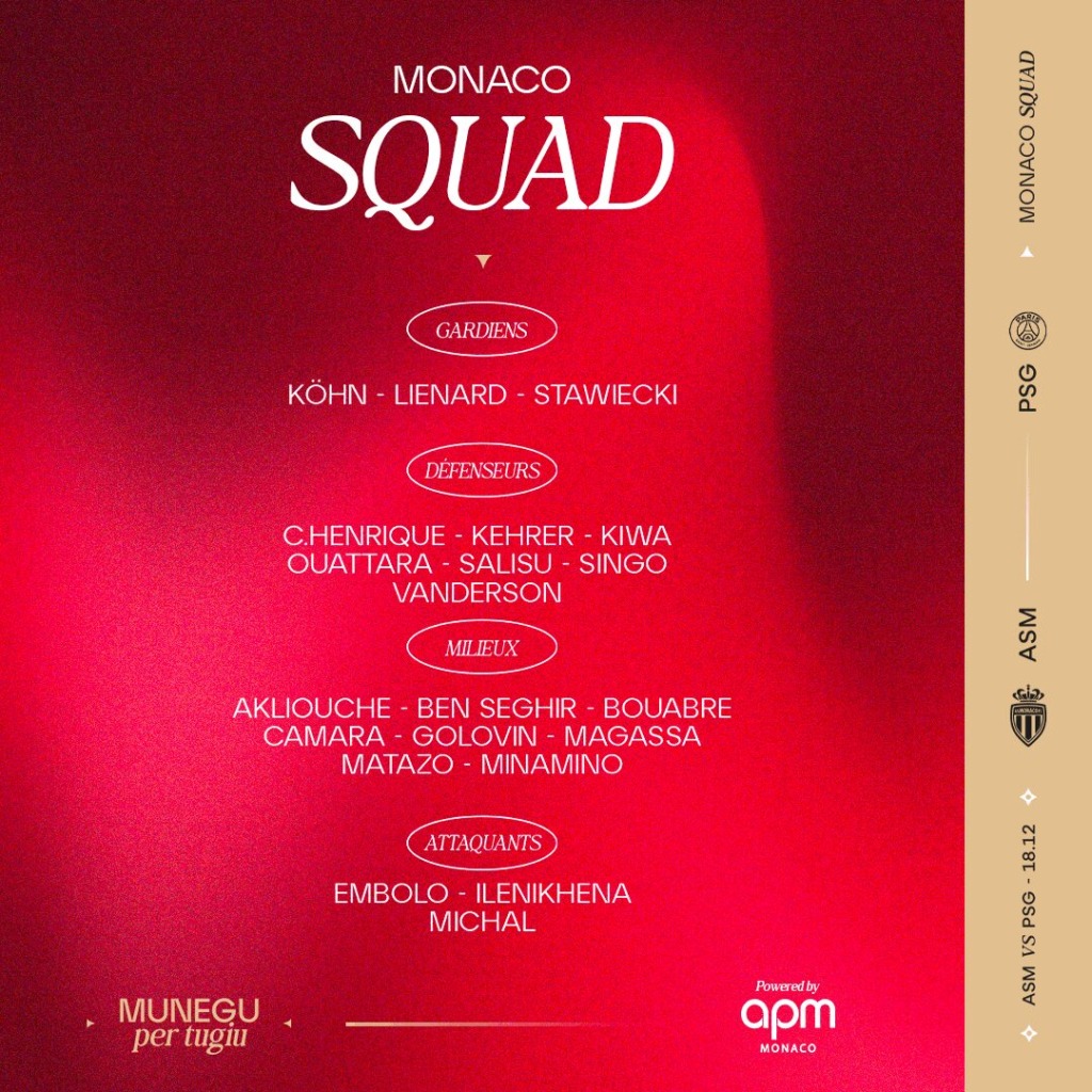 Alors avant de connaître le verdict de cette affiche qui sera diffusée sur l’antenne de beIN Sports 1 et à suivre en live-texte sur asmonaco.com, voici la composition du groupe convoqué par le technicien autrichien. A noter la présence de huit joueurs formés à La Diagonale, dont Saïmon Bouabré et Lucas Michal, venus renforcer le groupe avec Jules Stawiecki et Bradel Kiwa, en raison des absences.