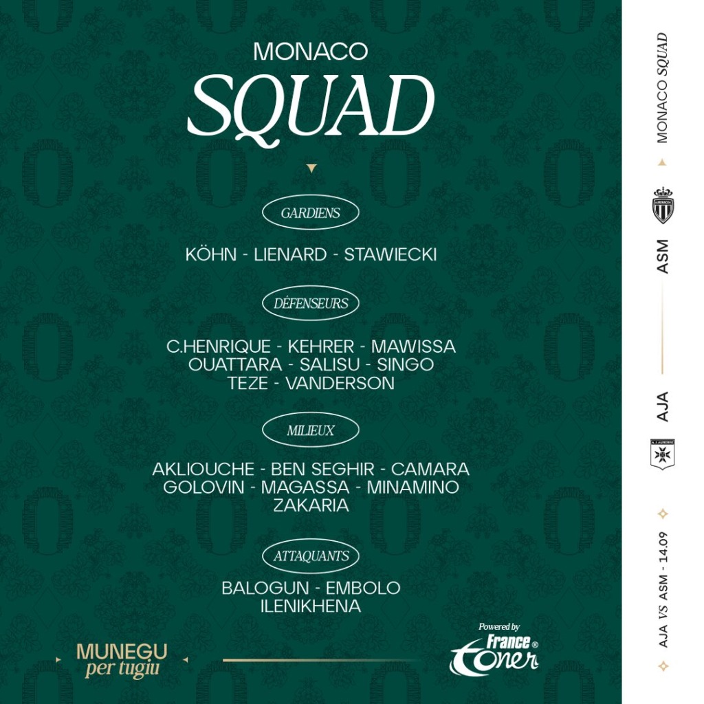 Alors avant d’en découdre dans l’enceinte mythique des bords de l’Yonne, dans une rencontre qui sera diffuséesur l’antenne de DAZNet à suivre en live-texte sur asmonaco.com, découvre le groupe convoqué par le coach Adi Hütter. A noter le retour de suspension de Lamine Camara, sélectionné par le Sénégal durant la trêve.