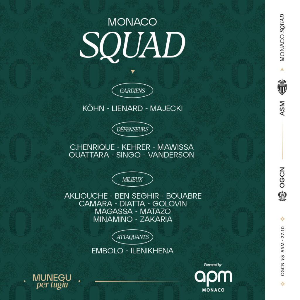 Un succès viendrait en tout cas étendre à 44% son taux de victoires dans ce rendez-vous très attendu chaque saison par les supporters des deux équipes. Alors avant d’en découdre dans ce sommet de la Côte d’Azur, qui sera diffusé sur l’antenne de beIN Sports 1 et à suivre en live-texte sur asmonaco.com, découvre le groupe convoqué par coach Adi.