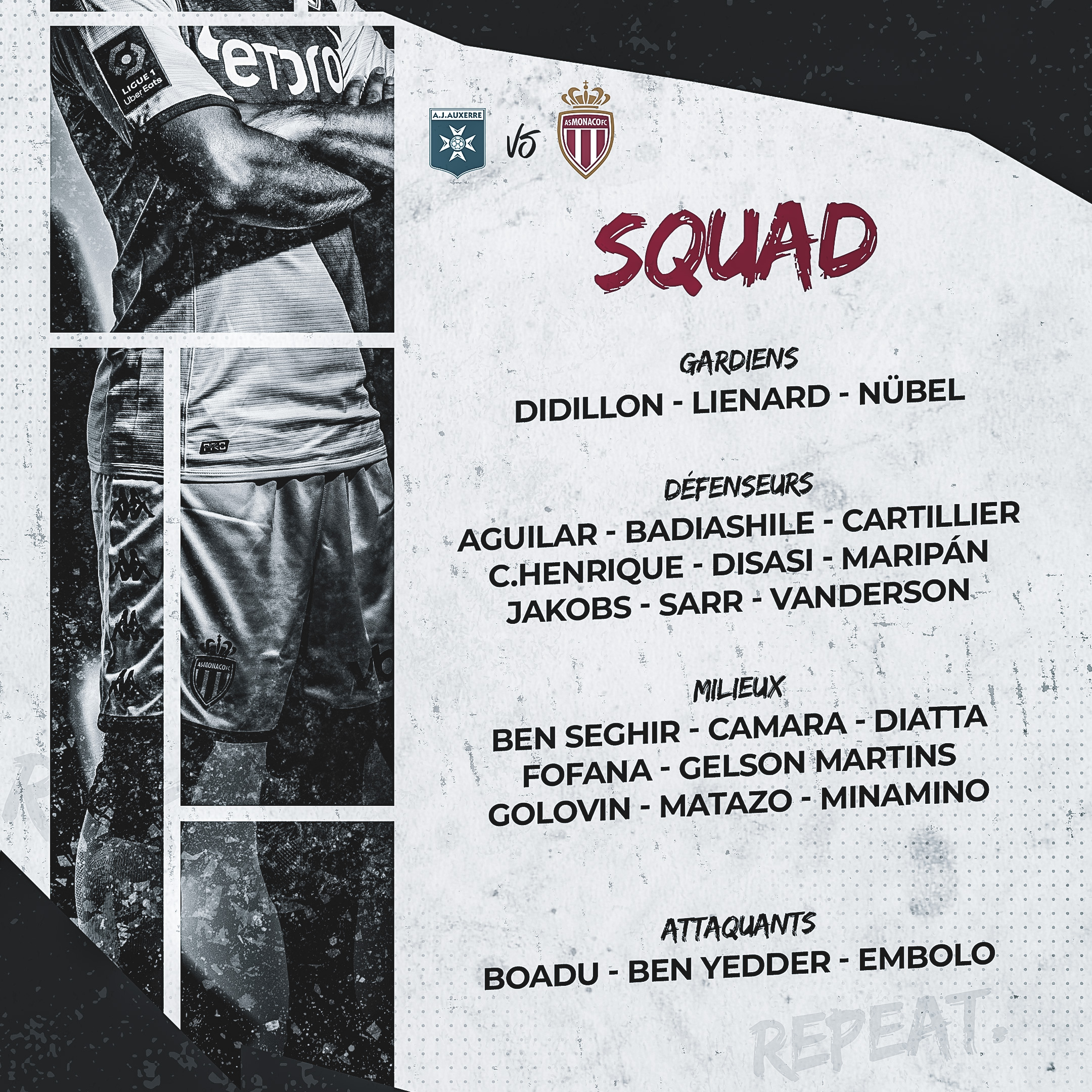 Alors avant le coup d’envoi de cette rencontre, qui sera à suivre en direct sur l’antenne de Prime Video et en live-texte sur asmonaco.com, voici le groupe convoqué par le coach monégasque.