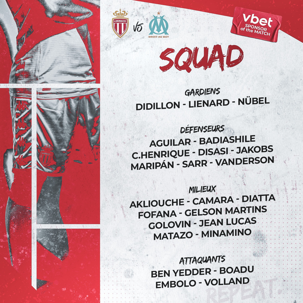 Alors avant le coup d’envoi de cet AS Monaco - OM, qui sera à suivre en direct sur l’antenne de Prime Video et en live-texte sur asmonaco.com, voici le groupe convoqué par le coach monégasque.