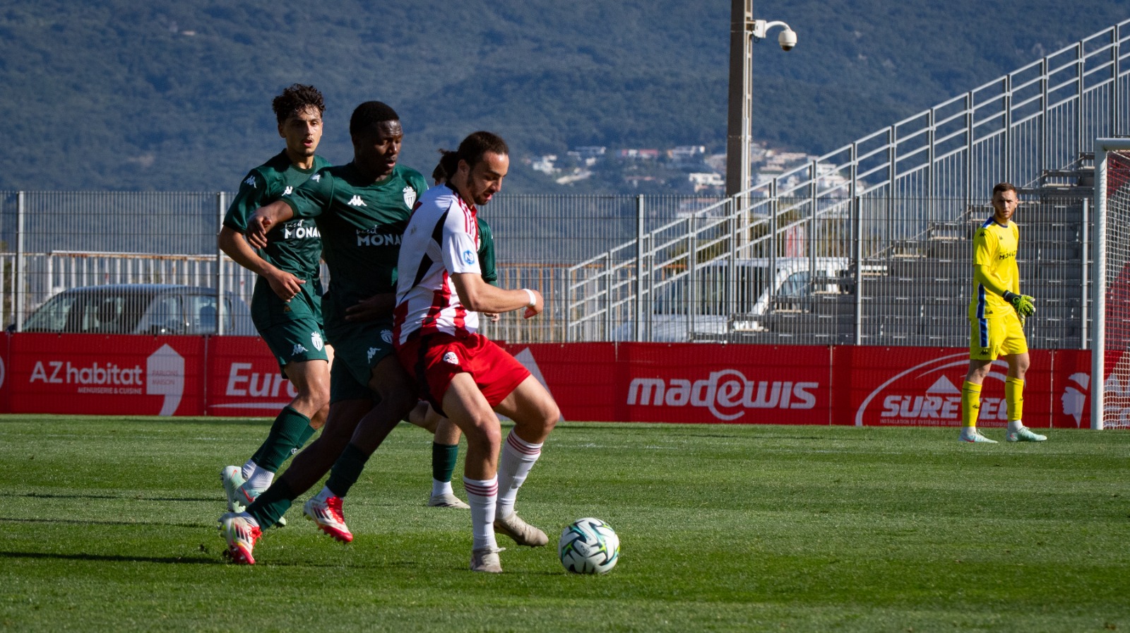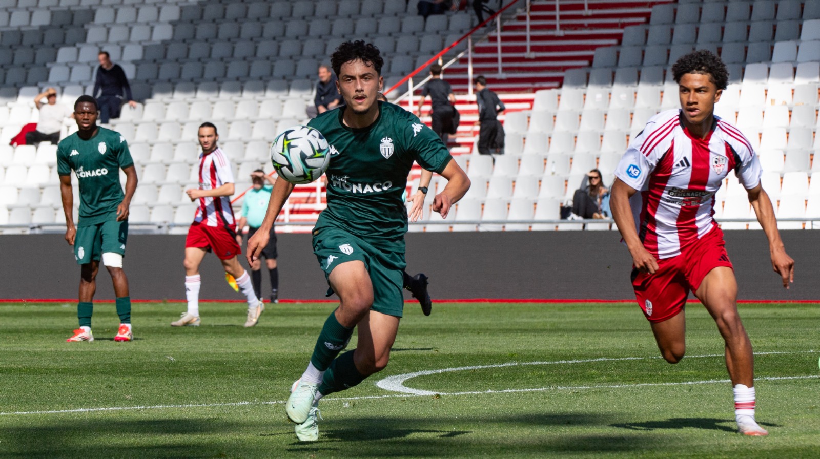 Le match débute par un pressing intense exercé par les Rouge & Blanc comme à leur habitude. Dans le premier quart d’heure, les Monégasques obtiennent deux corners sans se procurer de réelles occasions de but.