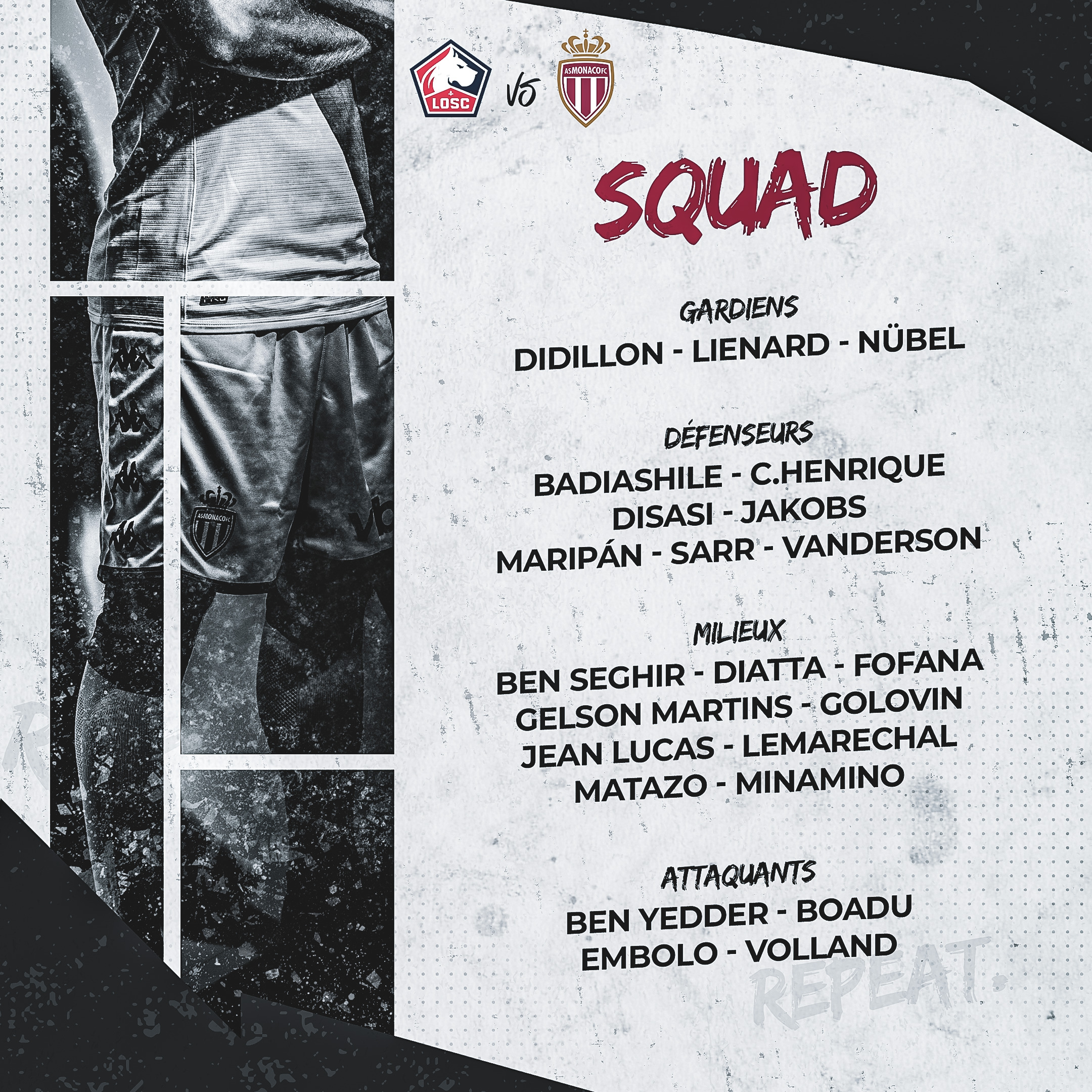 Avant le coup d’envoi de cette affiche du week-end, qui sera à suivre en direct sur l’antenne de Prime Video et en live-texte sur asmonaco.com, voici le groupe convoqué par le coach Philippe Clement.