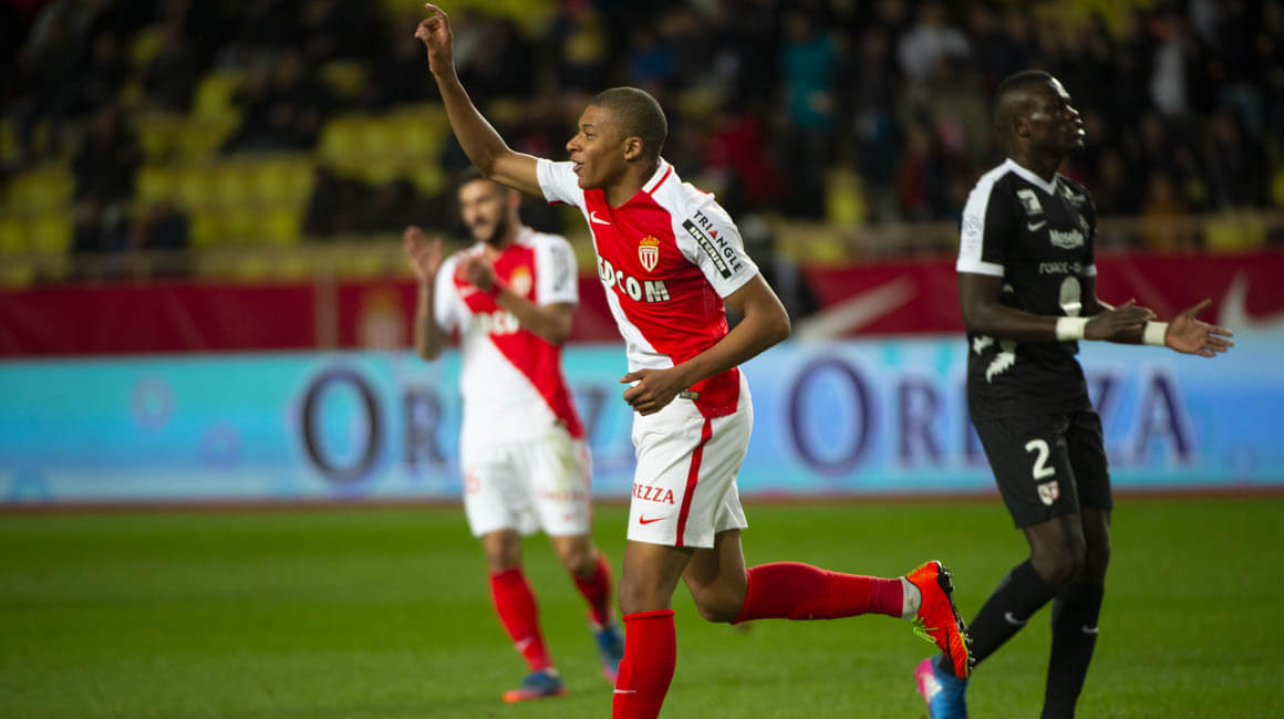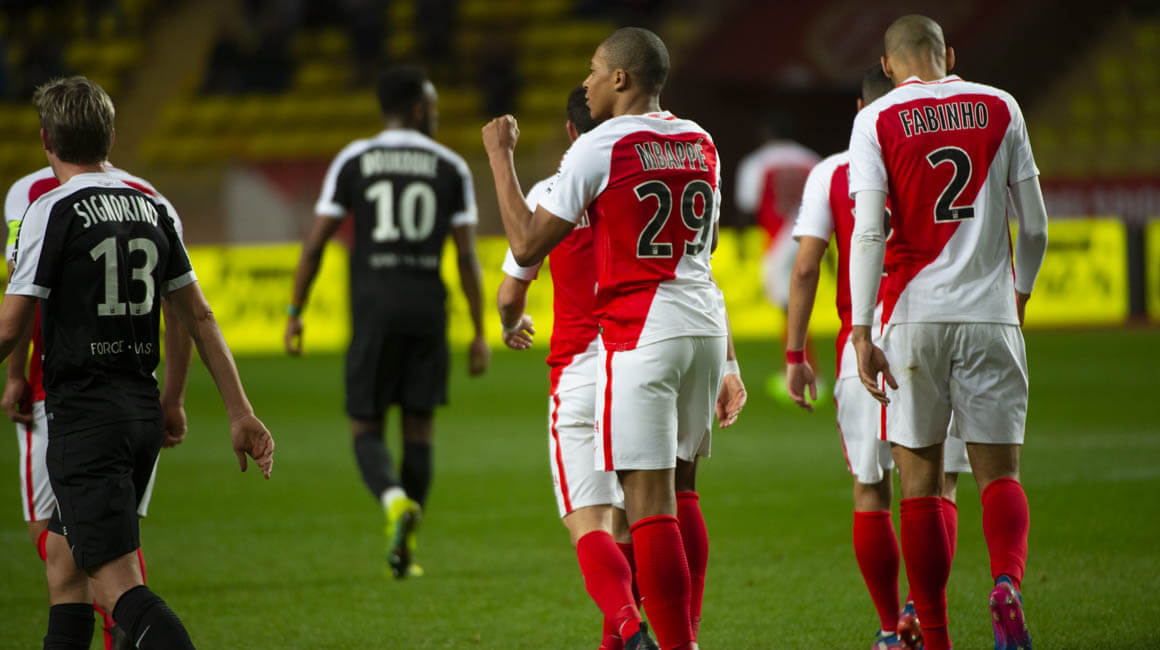 Déjà couronné de succès l'été précédent avec les moins de 19 ans Rouge et Blanc, avec qui il remporte la Coupe Gambardella 2016 en inscrivant un doublé en finale face au RC Lens, Kylian Mbappé se distingue une nouvelle fois, avec les pros'. En cette soirée d'hiver, le numéro 29 monégasque vient réchauffer l'atmosphère du Stade Louis-II en inscrivant trois buts face aux Grenats. Le premier est signé de son pied gauche sur une remise de la tête de Radamel Falcao.