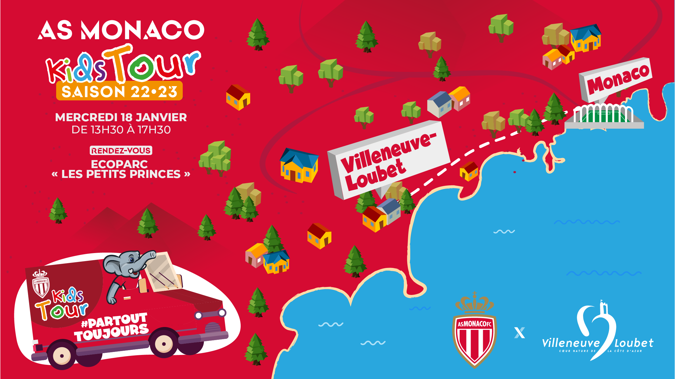 La 18ème étape du Kids Tour se tiendra à Villeneuve-Loubet. Lea commune, située à quelques kilomètres de Nice, accueillera l’AS Monaco de 13h30 à 17h30 au sein de l’écoparc « Les Petits Princes ».