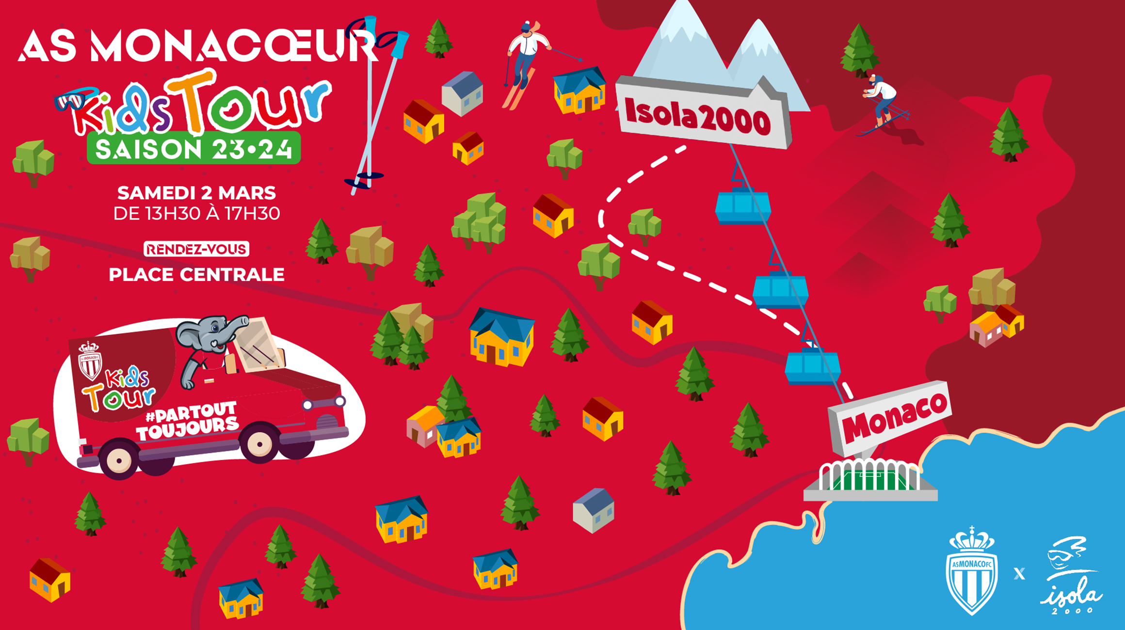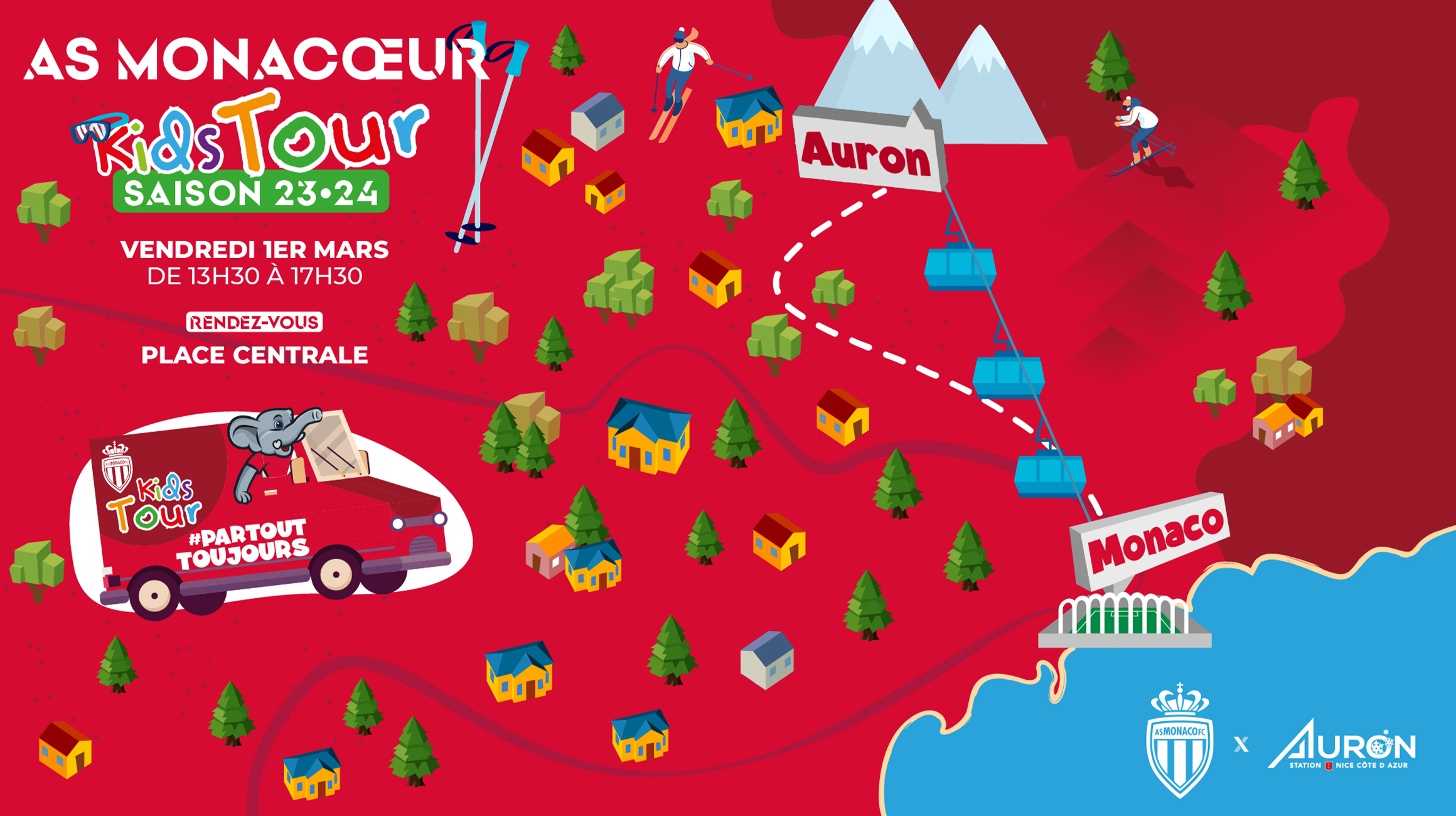 Pour cette deuxième édition, la caravane Rouge & Blanche fera d'abord halte à Auron (vendredi 1er mars, Place Centrale, de 13h30 à 17h30) et Isola 2000 (samedi 2 mars, Place centrale, de 13h30 à 17h30), avant de se rendre à Valberg (mercredi 6 mars, Place Charles Ginésy, de 13h30 à 17h30).