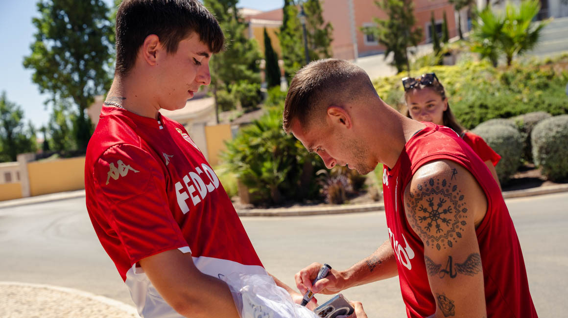 L’espace se fait de plus en plus rare. A mesure que les joueurs passent en sortant de l’entraînement et apposent leur signature sur son maillot, Maxence doit ruser pour trouver un peu de place pour chaque membre de l’effectif, sous le regard amusé de sa copine Flora. Tout sauf un problème pour ce supporter monégasque, en vacances au Portugal et arrivé à Lagos dès qu’il a su que Philippe Clement et ses hommes y effectuaient leur stage de présaison.