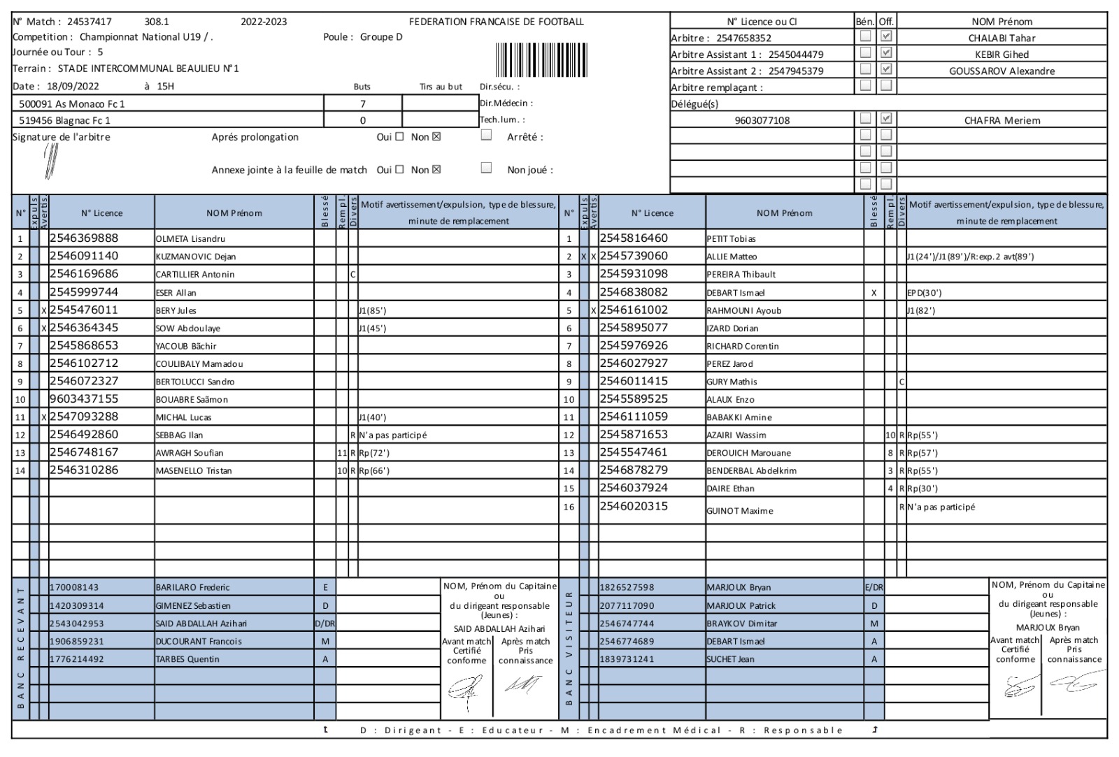 Retrouve la feuille de match complète