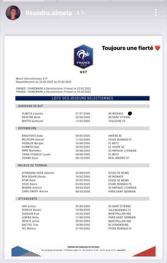 Comme chaque joueur du centre de formation, le natif d'Ajaccio souhaite jouer avec l’équipe première et signer un contrat professionnel à l’AS Monaco. En parallèle, il vise une participation aux qualifications de l’Euro avec l’Equipe de France U17 en mars prochain. Un processus en bonne voie. En compagnie de son coéquipier Eliesse Ben Seghir, il a été appelé par le sélectionneur José Alcocer pour affronter le Danemark lors du rassemblement qui a lieu actuellement à Clairefontaine.
