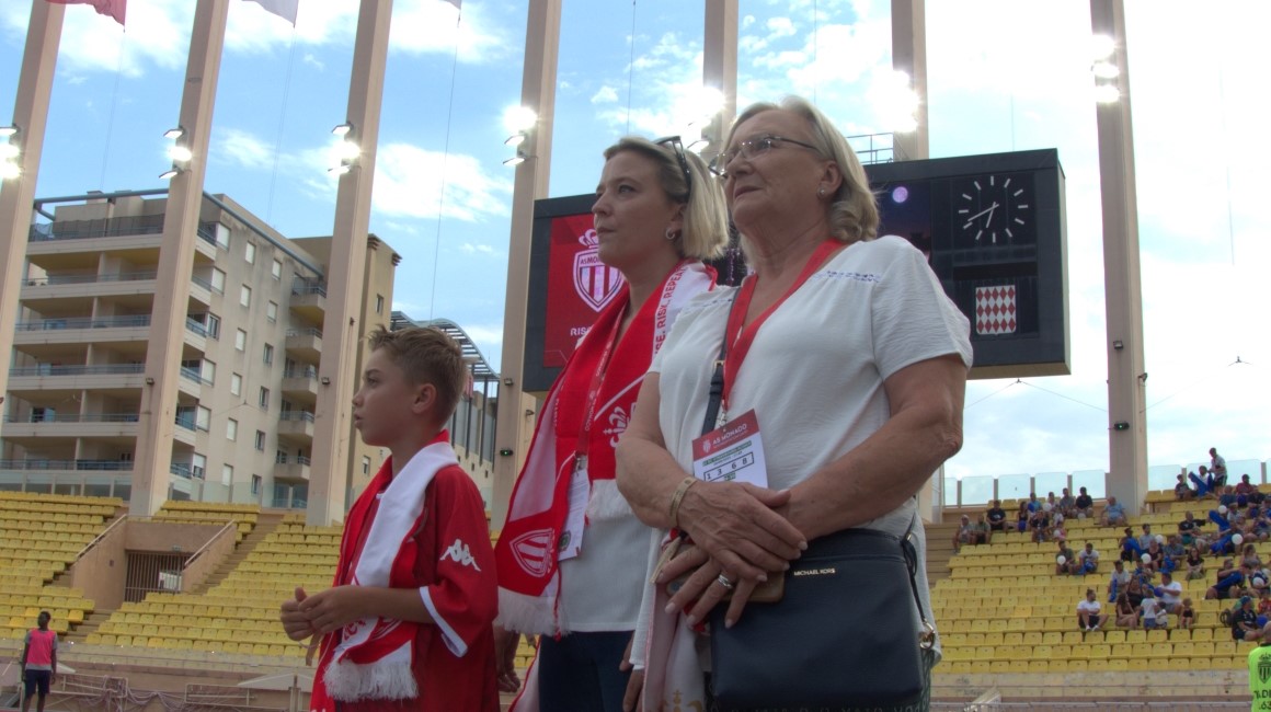 Maillot rouge et blanc sur le dos et écharpe aux couleurs de l’AS Monaco autour du cou, Andrea, 9 ans, accompagné de sa tante Camille, 42 ans, et de sa grand-mère Eliane, 70 ans, quitte le salon honneur, direction le bord du terrain.