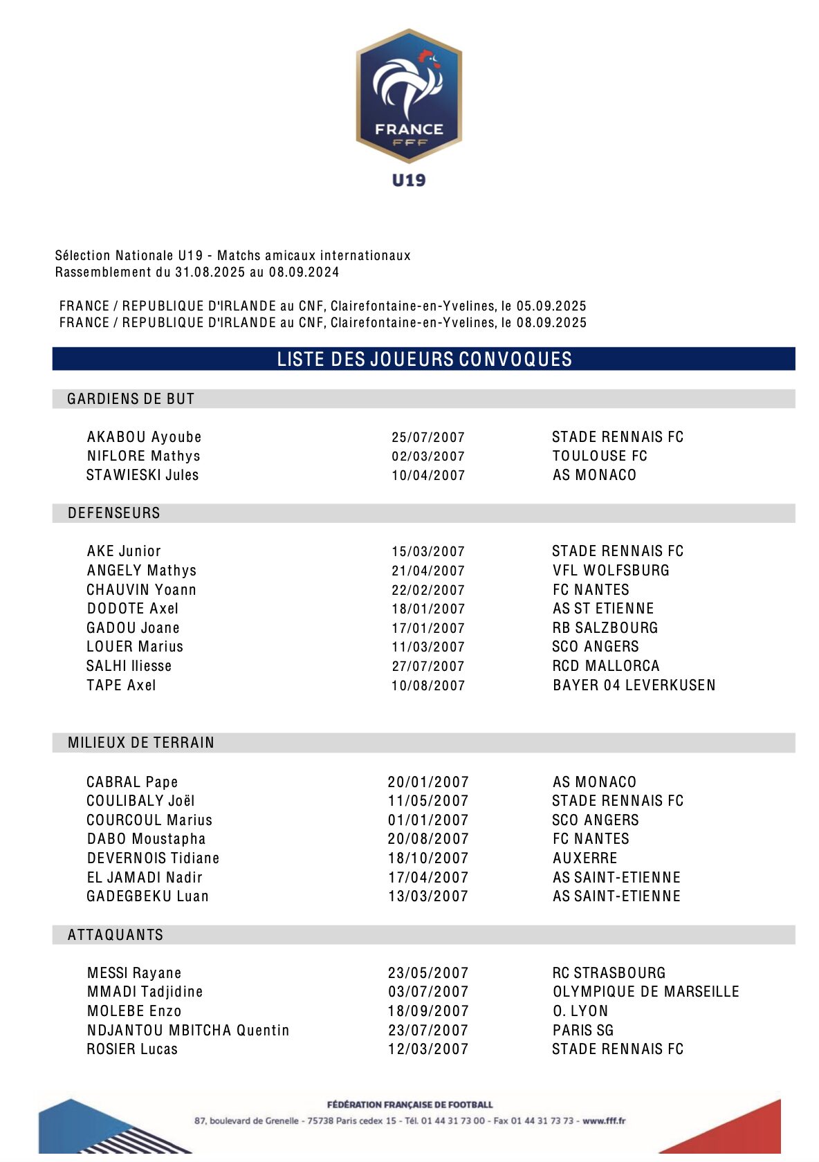 Au menu de ce rassemblement, deux rencontres amicales face à la République d'Irlande. Celles-ci se dérouleront au Centre Technique National de Clairefontaine le vendredi 5 septembre (16h00) et le lundi 8 septembre (11h00). Avant d'affronter les Îles Féroé, la Bulgarie et la Hongrie en novembre prochain pour une première étape importante dans le parcours de qualification, ces deux matchs vont permettre au sélectionneur et son staff d'effectuer d'importants réglages.