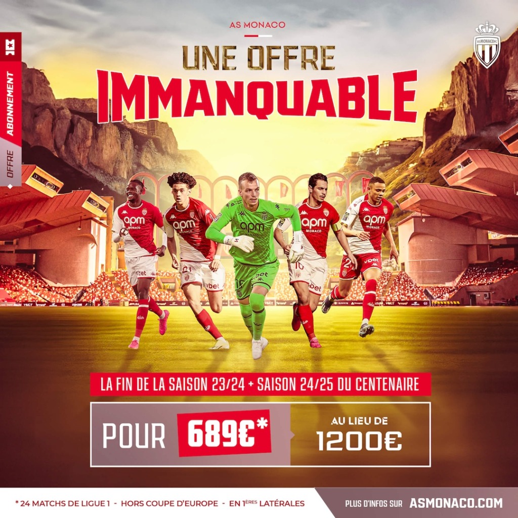 Ton engagement pour les sept matchs restants à domicile sur la phase retour est en effet proposé… à - 50% ! Mais ce n’est pas tout, puisque pour ne rien rater des prochaines échéances importantes qui attendent le club de la Principauté, cet abonnement est couplé à celui pour l’exercice 2024-2025, qui marquera le centenaire de l’institution monégasque. Là aussi, si tu souscris dès maintenant à cette offre, tu bénéficieras d’un prix très attractif, payable en trois fois sans frais (par chèque).