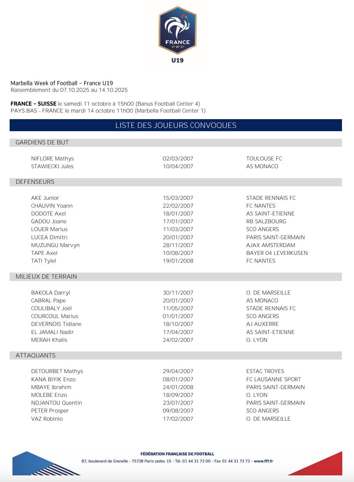 Les deux jeunes talents de l’Academy auront l’opportunité de se jauger contre la Suisse et les Pays-Bas, dans le cadre de deux matchs amicaux de préparation au tour 1 de qualification pour l’Euro 2026 de la catégorie. Pape et Jules auront même l’opportunité d’affronter leur partenaire en club, puisque Sirak Bein a lui été retenu avec la Nati U19, pour disputer elle aussi deux rencontres amicales.