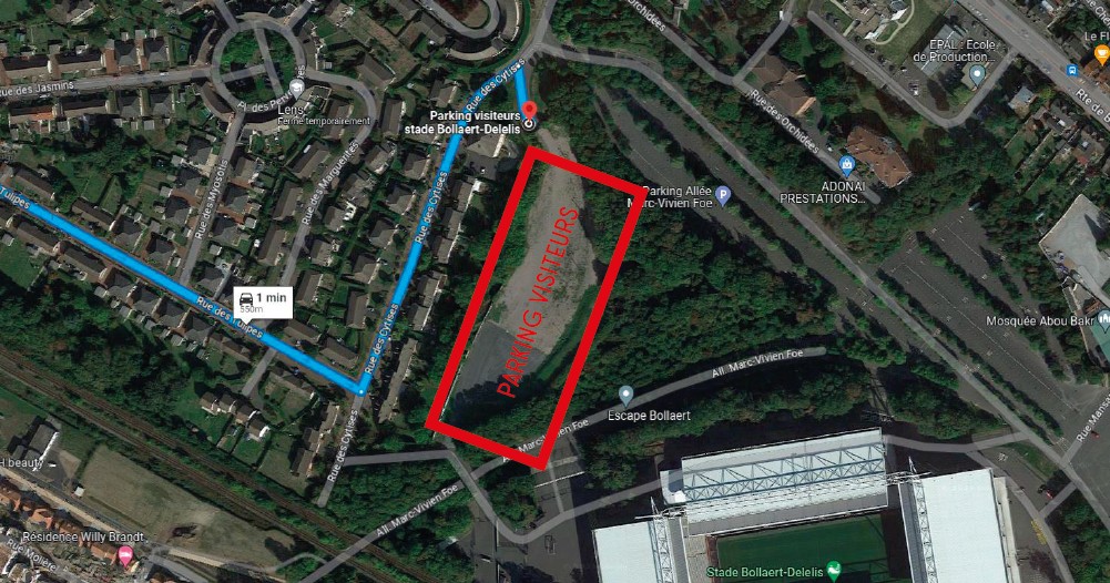 - Entrée parking et secteur visiteurs : Parking Visiteurs Stade Bollaert-Delelis. (Accès via la rue des tulipes, puis la rue des cytises) : Google Maps, Waze et Plans