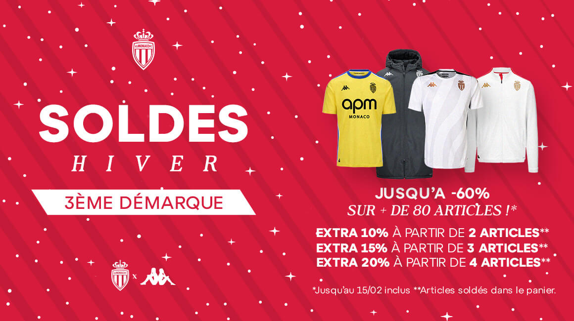 Il n'est pas trop tard pour en profiter ! Depuis le 2 janvier, la boutique en ligne et l'AS Monaco Football Store se sont mis en modesoldes d'hiver 2025. Une période - les soldes s'étendent jusqu'au 15 février prochain en Principauté - propice aux bonnes affaires, qui te permet d'afficher encore un peu plus ta passion pour l'AS Monaco... à prix (très) réduits !