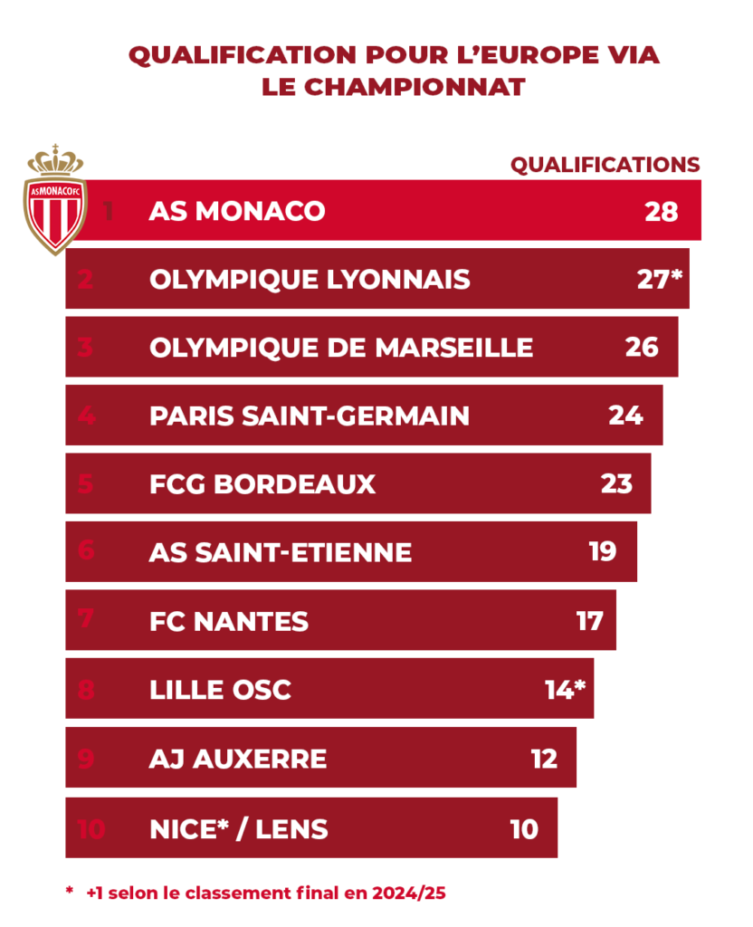 A côté de ça, les Rouge et Blanc ont terminé à trois reprises à la deuxième place (2014, 2018, 2024) et cinq fois sur la troisième marche (2015, 2016, 2021, 2022, 2025). Neuf podiums synonymes donc d’autant de qualification en Ligue des Champions ou en tours préliminaires. Un domaine où seul Paris fait mieux depuis la remontée du Club en 2013.