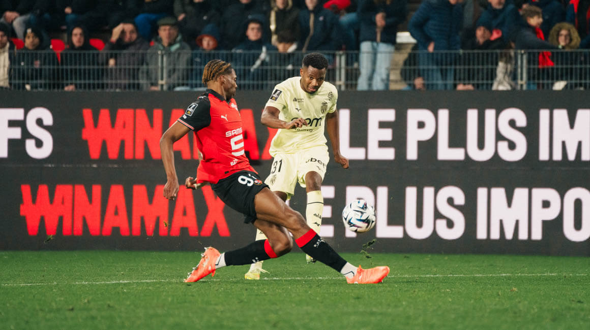 Le duel démarre sur un bon rythme au Roazhon Park, où 500 supporters monégasques ont pris place en parcage, même si les occasions se font attendre. La première intervient finalement sur un tir en demi-volée d’ Ansu Fati capté par Samba (17e). Malheureusement sur une montée du jeune rennais Aït-Boudlal, ce dernier reprend victorieusement un centre de Camara avec beaucoup de réussite (1-0, 20e).
