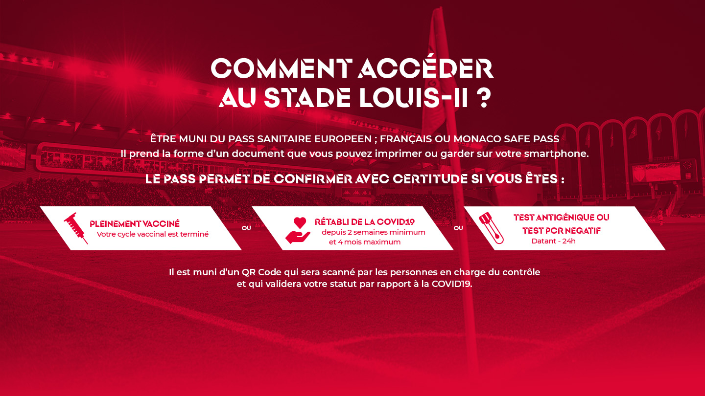 Attention ❗ Tu ne pourras accéder au Stade Louis-II que sur présentation d’ un pass sanitaire européen valide (pour les personnes de 16 ans ou plus), ainsi qu’une pièce d’identité. En raison des contrôles liés à la situation sanitaire,nous te conseillons donc de venir très tôt afin de ne pas manquer le début de la rencontre. Par ailleurs, le masque reste obligatoire partout (y compris dans l’espace public), et ce, à partir de 6 ans.