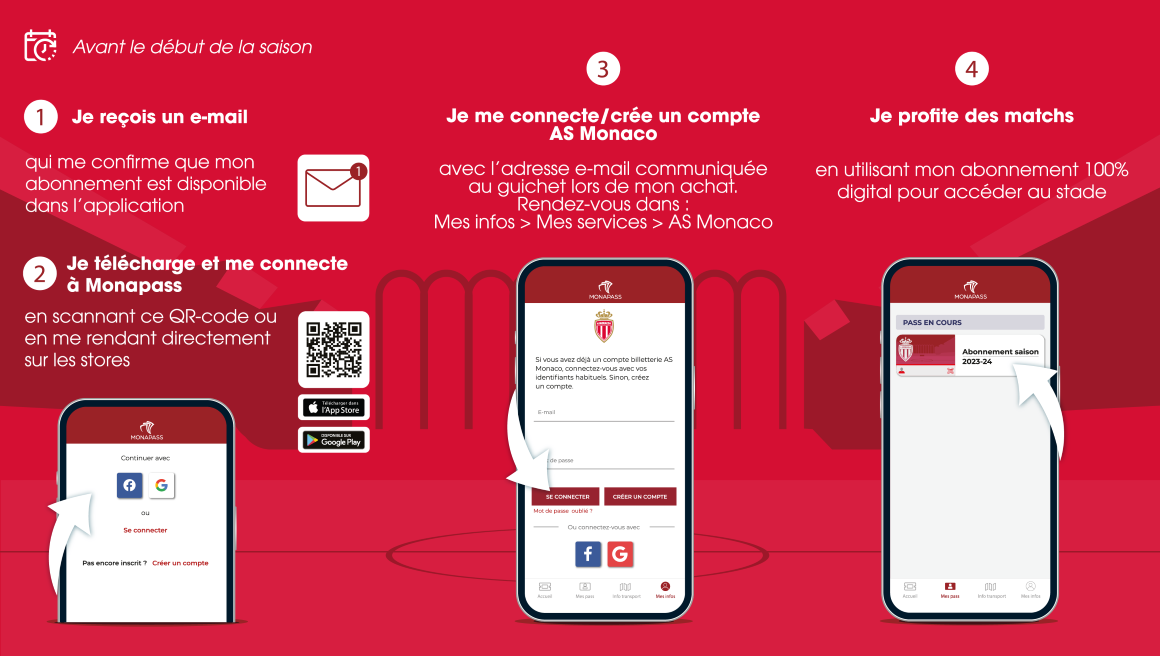 L’AS Monaco propose une grande nouveauté à ses nouveaux abonnés pour la saison 2023-2024 (*). Place à une option 100% numérique, via l’application Monapass, pour retrouver ton abonnement sur ton téléphone en quelques clics, n’importe où et n’importe quand dans la saison.