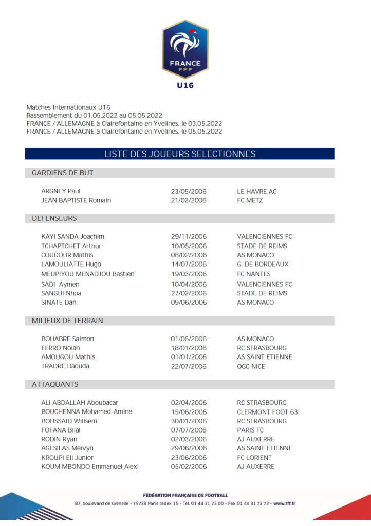 Ils font la fierté de l’Academy ! Déjà convoqués lors des trois derniers rassemblements de l’équipe de France U16, Dan Sinaté, Mathis Coudour et Saïmon Bouabré, rejoindront à nouveau le Centre National du Football au mois de mai. Les trois joueurs qui évoluent avec les U17 de l’AS Monaco, entraînés par Manu Dos Santos, ont ainsi été appelés pour disputer deux matchs amicaux face à l’Allemagne.