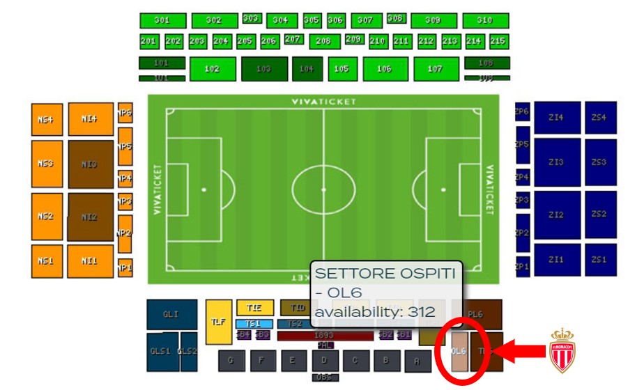 - Tribune conseillée pour des raisons de sécurité : SETTORE OSPITI – OL6 (voir plan ci-dessous)