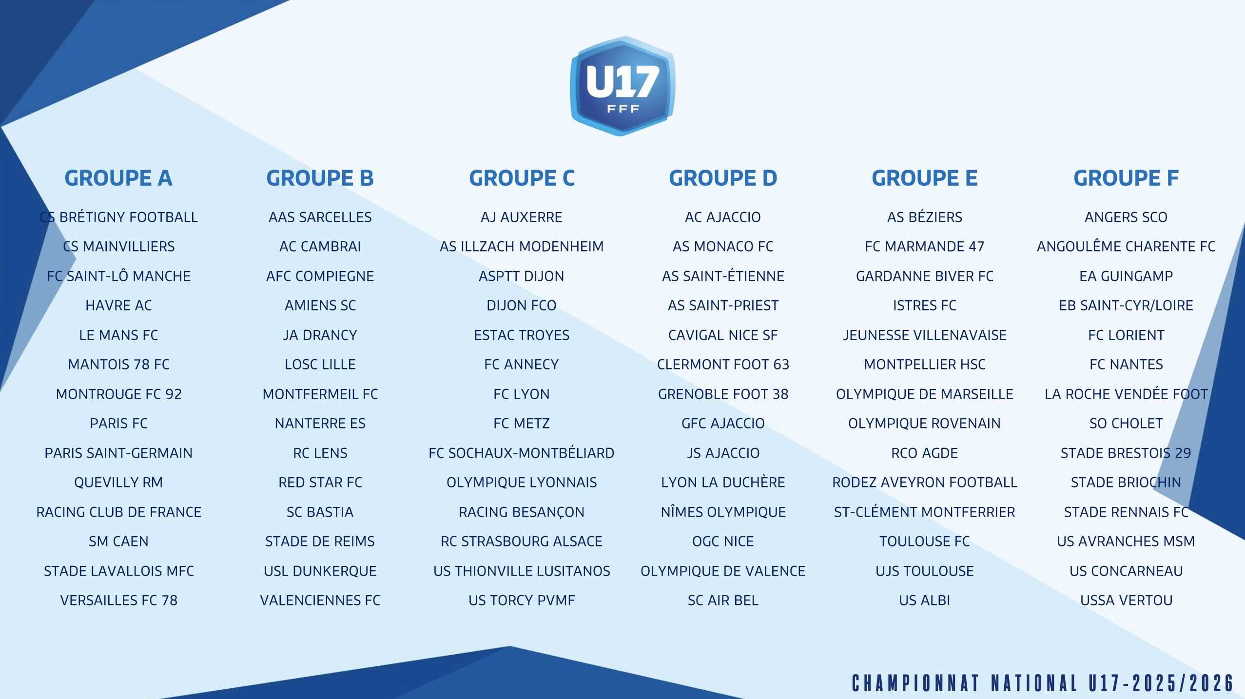 Pour ce qui est du Championnat National U17 on y dénombre un total de 84 équipes réparties en 6 groupes de 14 équipes, soit 26 matchs par équipe dans la saison régulière. Comme en U19, celle-ci sera suivie d'une phase finale avec quarts de finale, demi-finales et finale. Dans le Groupe D, l'AS Monaco va retrouver la plupart des adversaires de la saison 2024-2025. Certes l'OL a basculé dans le groupe C, mais 12 clubs son toujours présents. Clermont Foot G3 et le GFC Ajaccio sont les deux petits nouveaux d'un groupe qui s'annonce très relevé entre clubs pros toujours costauds et clubs amateurs aux dents longues. Petit originalité, Manu Dos Santos et ses joueurs se déplaceront trois fois à Ajaccio durant cette saison 2025-2026.