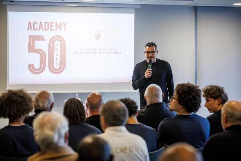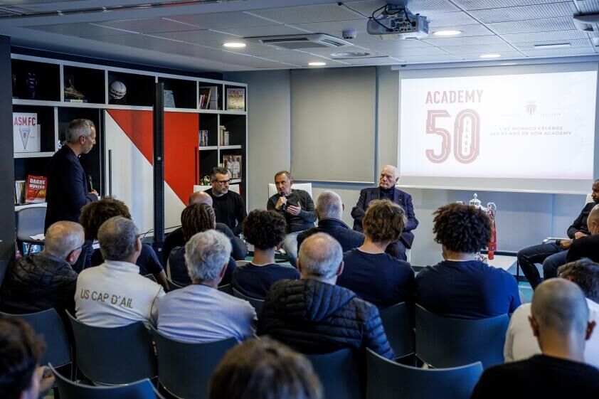 En présence d’une soixantaine de personnes, parmi lesquelles Thiago Scuro, directeur général de l’AS Monaco, Alain Broche, Président du District Côte d’Azur et Vice-président de la Ligue Méditerranée, des dirigeants et bénévoles des clubs partenaires ÜNSEME (US Cap-d’Ail, FC Beausoleil, AS Roquebrune Cap-Martin), des abonnés 25/26 et des membres actuels de l’Academy, cet événement avait pour but de retracer les cinquante années qui ont fait de la formation monégasque un pilier de l’identité du Club et se projeter sur les défis auxquels elle devra répondre dans le futur.