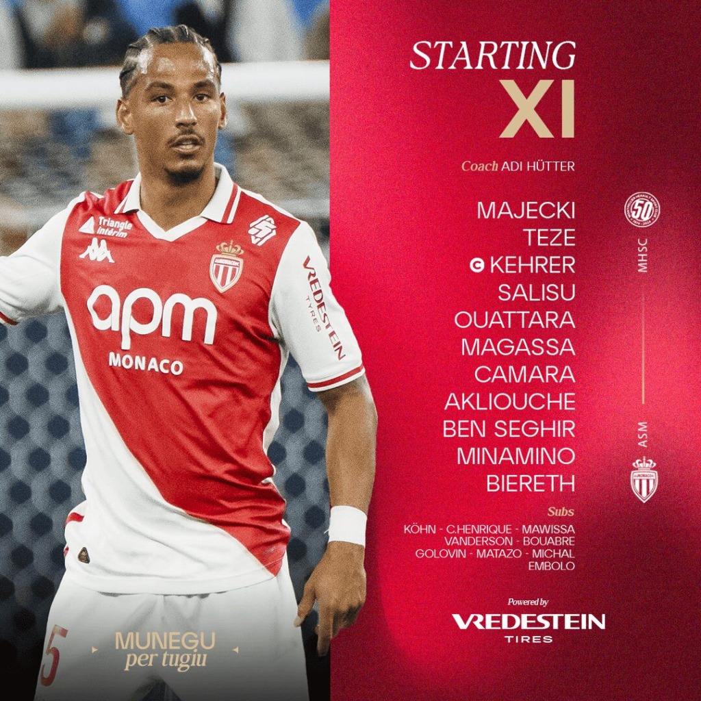 AS Monaco: Majecki - Teze (Vanderson, 65’), Kehrer ©, Salisu, Ouattara (C.Henrique, 61’) - Magassa, Camara - Akliouche (Michal, 61’, Golovin, 81’), Minamino, Ben Seghir (Embolo, 77’) - Biereth