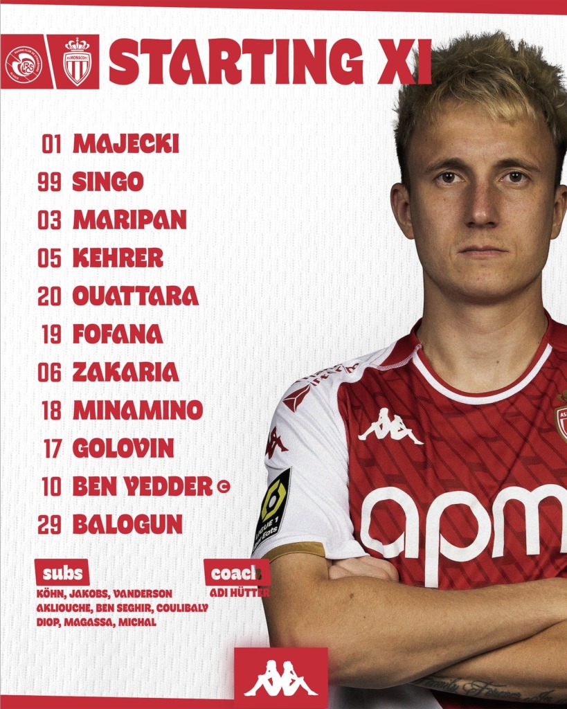 AS Monaco: Majecki - Singo, Maripán, Kehrer, Ouattara (Jakobs, 59’) - Minamino (Akliouche, 59’) Fofana (Ben Seghir, 59’), Zakaria, Golovin - Balogun, Ben Yedder ©.