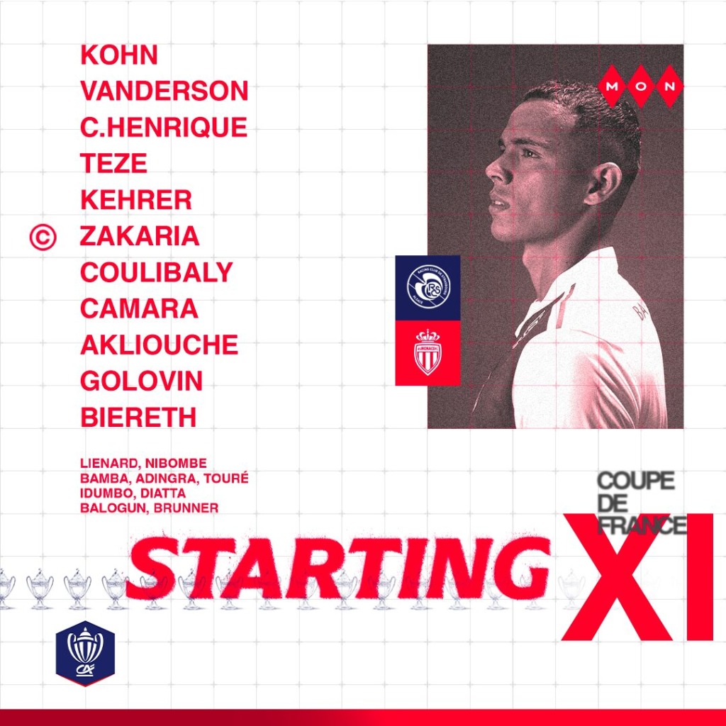 All'inizio di questo ottavo di finale, il tecnico monegasco mantiene il suo 3-4-2-1 con il ritorno di Mika Biereth in attacco. Sostituto all'inizio della partita contro il Rennes, Maghnes Akliouche torna in formazione dietro l'attaccante, proprio come Vanderson e Caio Henrique come ali. Denis Zakaria torna finalmente titolare in difesa centrale con Thilo Kehrer e Jordan Teze.