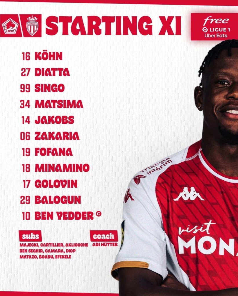 Il tecnico Adi Hütter rimane fedele ai suoi schemi tattici in vista della trasferta a Lilla, schierando una formazione votata all’attacco. Il modulo 4-4-2 sperimentato contro il Metz rimane invariato, con un solo cambiamento degno di nota: il ritorno di Denis Zakaria a centrocampo, dietro a un ambizioso quartetto composto da Minamino - Ben Yedder - Balogun - Golovin. Wilfried Singo e Chrislain Matsima presidiano la difesa centrale.