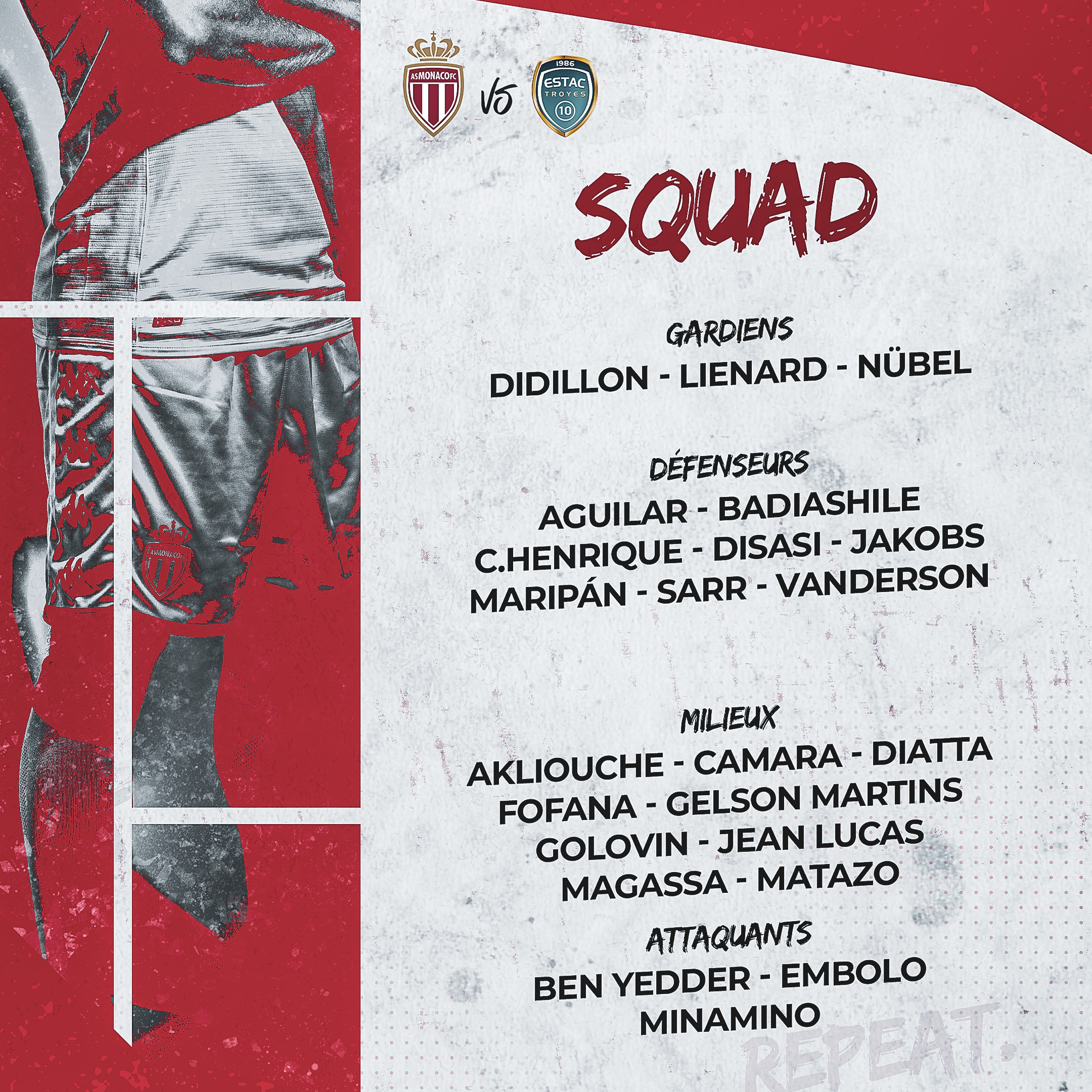 Alors en attendant le coup d’envoi de cette rencontre, qui sera à suivre sur Prime Video et sur asmonaco.com, voici le groupe convoqué par Philippe Clement.