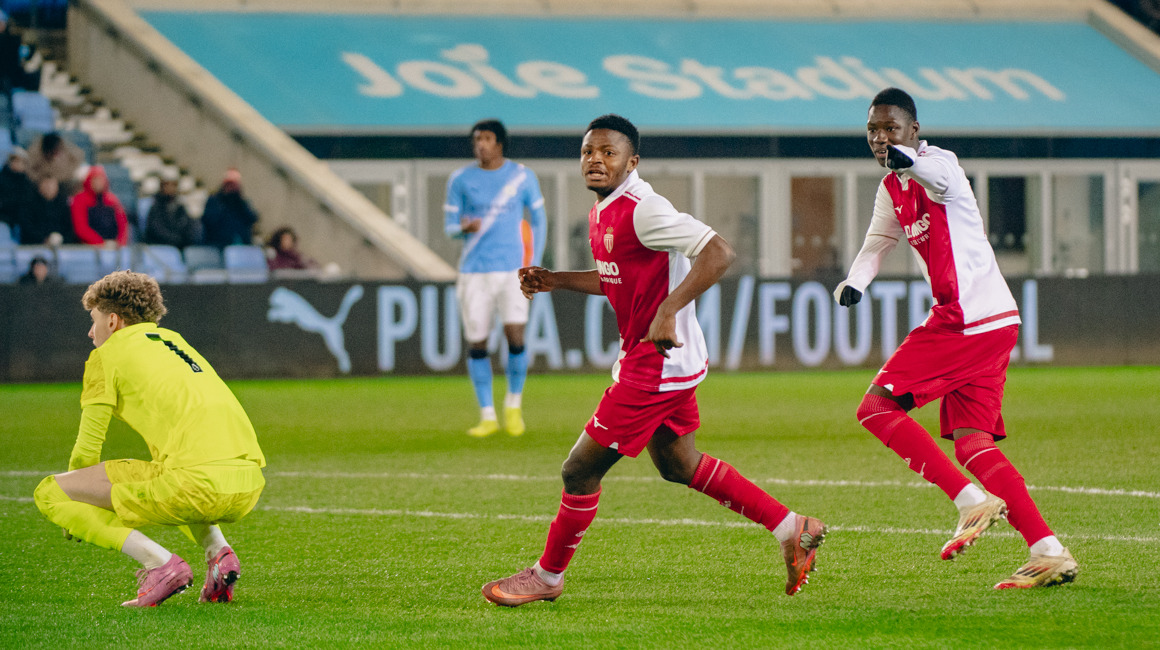 Gênée par un vent contraire, la défense monégasque subissait quelque peu la pression adverse mais restait solide tout au long de cette première période. Aux abords de la surface anglaise c’est à nouveau Yasir Mouh qui se montrait dangereux à la 40e minute, poussant le gardien à dévier son tir en corner. Si celui-ci ne donnait rien, un corner suivant au bout du temps additionnel permettait à Kevin Sitou de faire le break d’une tête puissante après avoir été parfaitement trouvé par Malick Sylla.