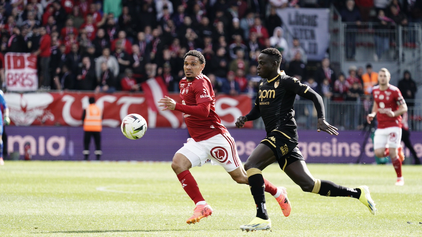 Attention aux Brestois qui poussent fort dans cette fin de première période. Sur une belle action construite, Jona Martin décale Lala qui centre devant le but monégasque… mais heureusement personne ne peut reprendre et Vanderson dévie en corner. 📐