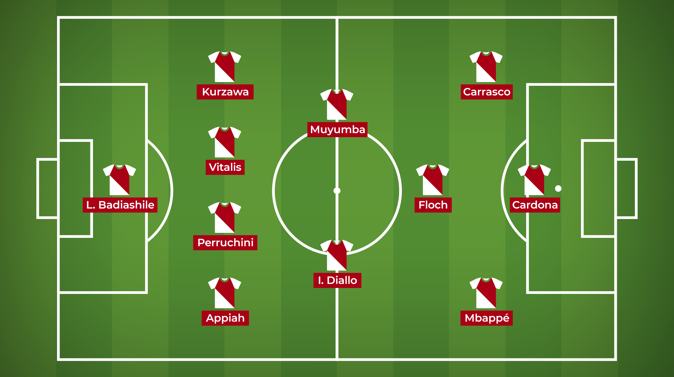 L.Badiashile – Appiah, Perruchini, Vitalis, Kurzawa – Muyumba, I. Diallo – Mbappé, Floch, Carrasco – Cardona
